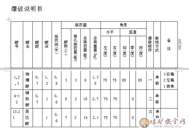 3、裝藥放炮:裝藥放炮工按作業(yè)規(guī)程規(guī)定爆破參數(shù)進(jìn)行裝藥檢查,放炮時(shí)先放掏槽眼,其次輔助眼,再而周邊眼,巷道成形規(guī)整,不得出現(xiàn)超挖欠挖現(xiàn)象。