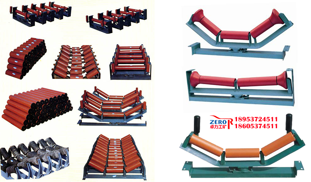 有槽形托輥、平形托輥、調(diào)心托輥、緩沖托輥。槽形托輥(由3個(gè)輥?zhàn)咏M成)支承承載分支,用以輸送散粒物料;調(diào)心托輥用以調(diào)整帶的橫向位置,避免跑偏;緩沖托輥裝在受料處,以減小物料對帶的沖擊。